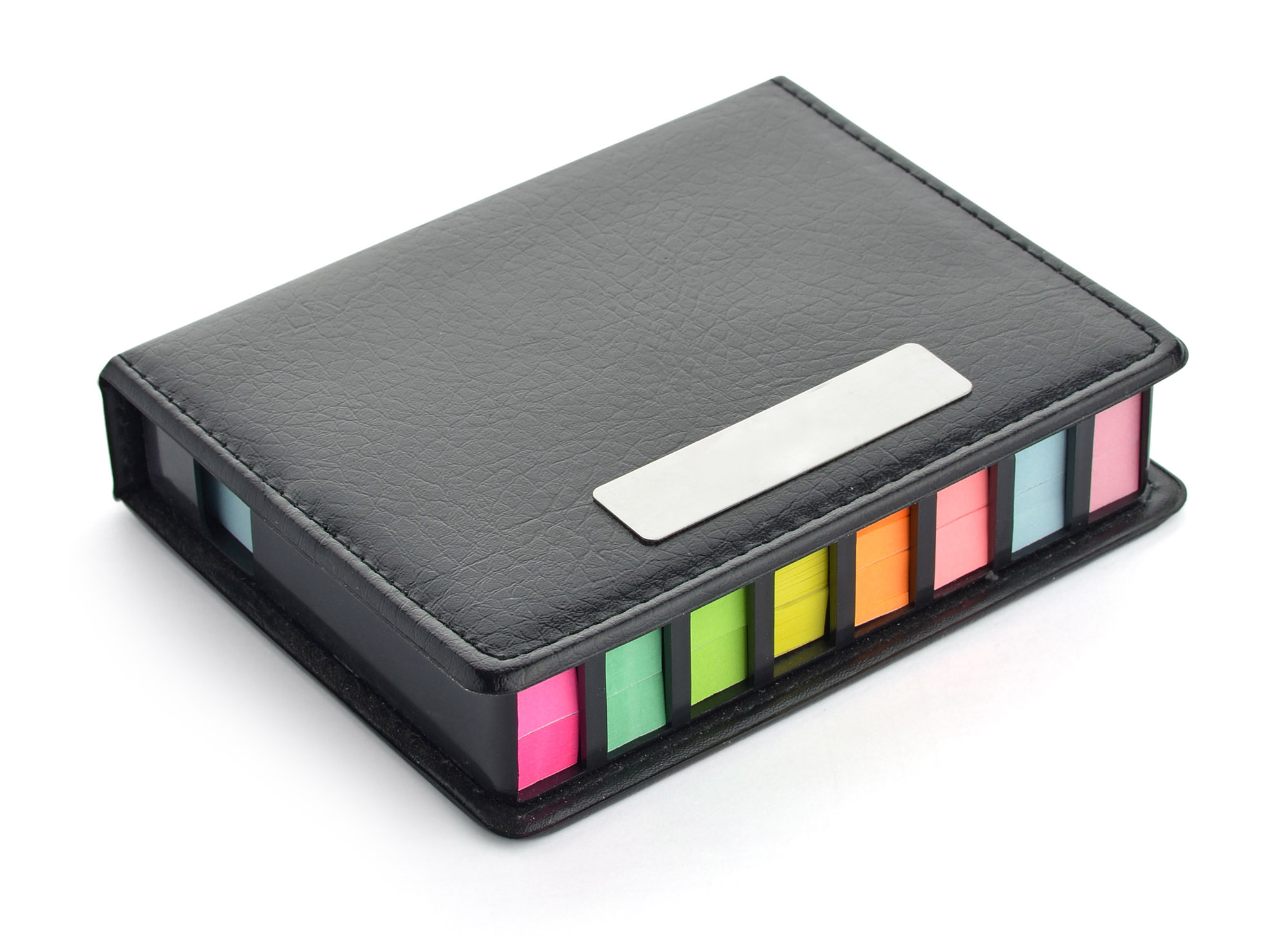 Zestaw karteczek samoprzylepnych w eleganckim, czarnym etui. W skład zestawu wchodzą dwa większe bloczki karteczek oraz osiem małych bloczków zakładek indeksowych w różnych kolorach. Pudełko zostało zaprojektowane tak, aby każdy element zestawu miał swoje miejsce, co zapobiega ich mieszaniu się. Dodatkowo, wewnątrz etui znajduje się kartka przeznaczona na notatki. Logo można wygrawerować na metalowej blaszce, która jest dołączona osobno i przeznaczona do umieszczenia na wierzchu etui. W przypadku zakupu produktu z grawerem, blaszka zostaje przyklejona do etui.