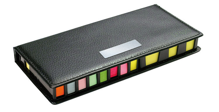 Zestaw karteczek samoprzylepnych pakowanych w czarne etui. Zestaw zawiera 1 bloczek dużych karteczek, 2 bloczki średnich karteczek i 8 małych bloczków zakładek indeksowych w różnych kolorach. Pudełko posiada miejsca na każdy z zestawów karteczek, dzięki czemu te się nie mieszają. W etui umieszczona jest kartka z miejscem na notatki. Logo grawerujemy na metalowej blaszce, którą można umieścić na wierzchu etui. Blaszka jest dołączona osobno.