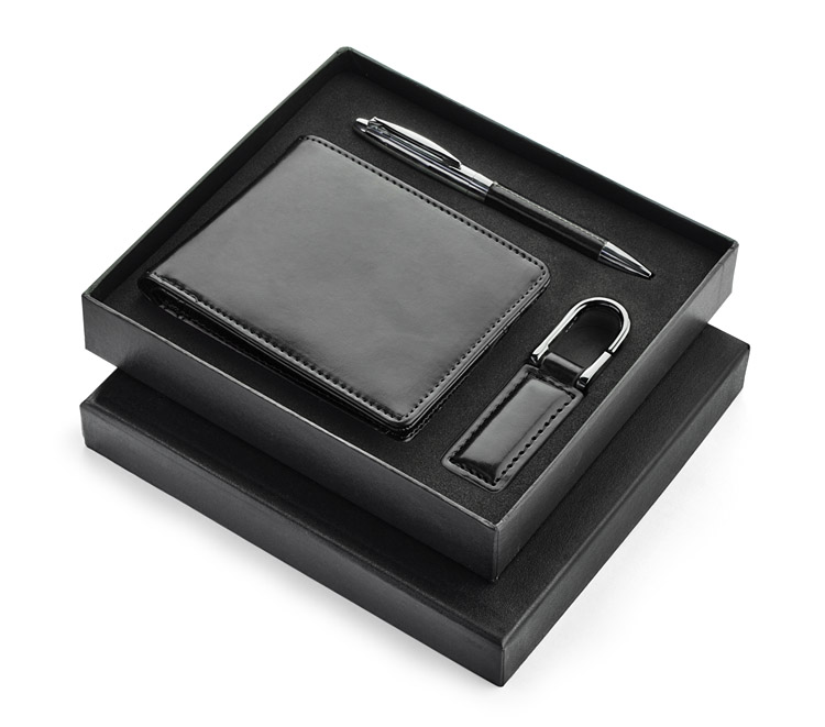 Komplet upominkowy zawierający portfel, brelok oraz metalowy długopis. Portfel wykonany z ekoskóry zawiera 2 przegródki na banknoty, kieszeń na bilon oraz dodatkowe kieszenie na karty kredytowe czy paragony. Całość zapakowana w eleganckie czarne pudełko. Grawerujemy na każdym elemencie lub na pudełku. Wymiary produktu 115 x 91 x 15 mm (portfel), 133 x ⌀10 mm (długopis), 65 x 25 x 5 mm (brelok), 181 x 163 x 31 mm (opakowanie)