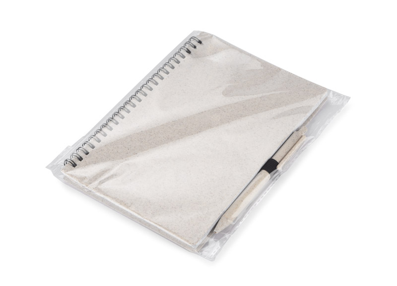 Notes TRESA z długopisem, kolorystyką dopasowanym do okładki. Długopis oraz okładka notesu wykonane są ze słomy pszenicznej. Notes na spirali, posiada 70 kartek w kratkę wykonanych z recyklingowanego papieru. Format A5. Wkład w długopisie w kolorze niebieskim.