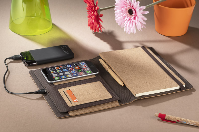 Teczka CHARCO to produkt łączący wygodę użytkowania i naturalny design. Wewnątrz znajduje się wbudowana ładowarka indukcyjna o mocy 5W, wymienny notes 64-kartkowy A5 z korkową okładką, kieszonki na wizytówki, kieszeń na niewielkie akcesoria biurowe oraz miejsce na długopis. Do zestawu dołączony jest również kabel do podłączenia ładowarki indukcyjnej. Okładka wykonana jest z naturalnego korka. Teczka zamykana na gumkę. Pakowana w eleganckie, proste pudełko papierowe.