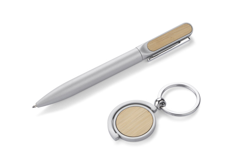 Elegancki zestaw upominkowy SELO składa się z długopisu i breloka. Oba produkty posiadają bambusowe elementy co nadaje im interesujący wygląd. Zestaw SELO to idealny pomysł na prezent. Zapakowane w pudełko imitujące bambus.