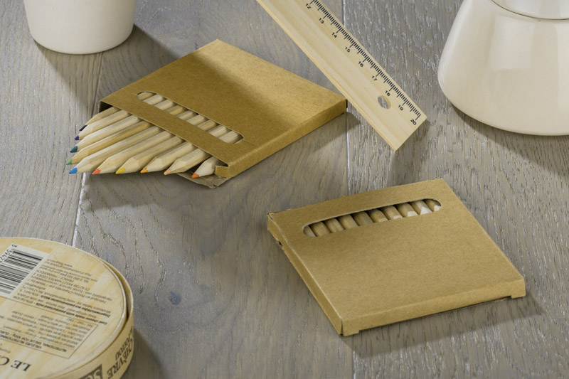 Drewniane kredki w dwunastu kolorach. Zapakowane w poręczny kartonik z okienkiem. Logo nadrukujemy na kartoniku.