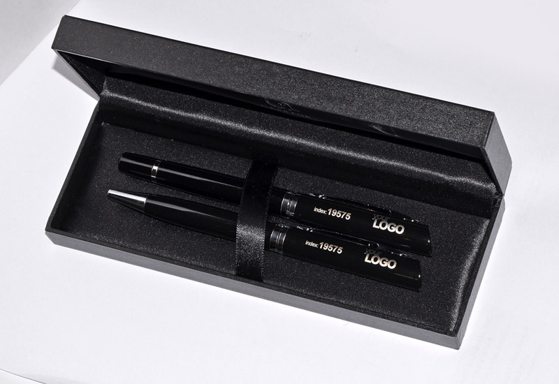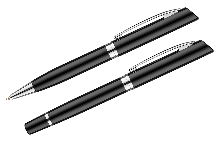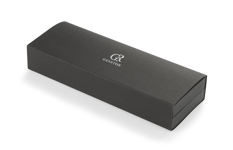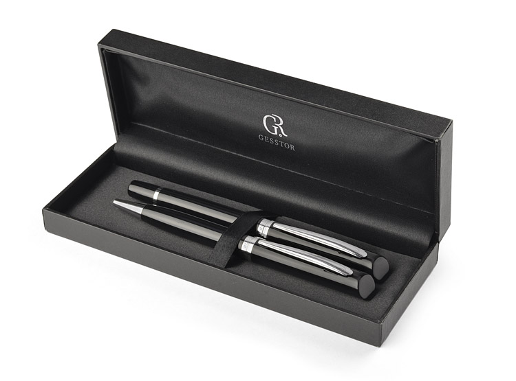 Zestaw piśmienniczy o klasycznej elegancji zawierający długopis oraz pióro kulkowe. Zapakowany w pudełko wykonane z materiału skóropodobnego (PU). Wszystkie elementy zestawu oznaczone subtelnym logo marki GESSTOR oznaczającej produkty o wyjątkowej jakości i pięknym wzornictwie. Wymiar długopisu - 139 x 12mm, wymiar pióra - 138 x 12 mm.