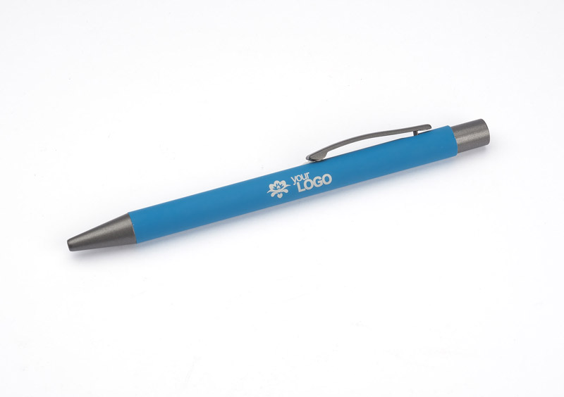 Długopis GOMA to prosty design połączony z przyjemną w dotyku gumowaną powierzchnią. Całość jest utrzymana w lekkich, matowych barwach. Wykonany z aluminium. Wykończenia w kolorze grafitowym. Wkład w kolorze czarnym.