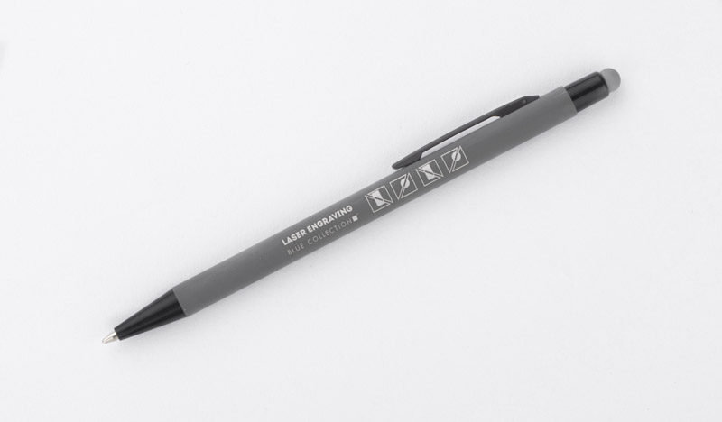 Klasyczny, cienki długopis PRIM wykonany z aluminium pokrytego gumowaną powłoką typu soft touch. Na górze końcówka do obsługi ekranów dotykowych w kolorze dopasowanym do korpusu długopisu. Wykończenia w kolorze czarnym. Długopis automatyczny. Wkład typu X20 w kolorze niebieskim.