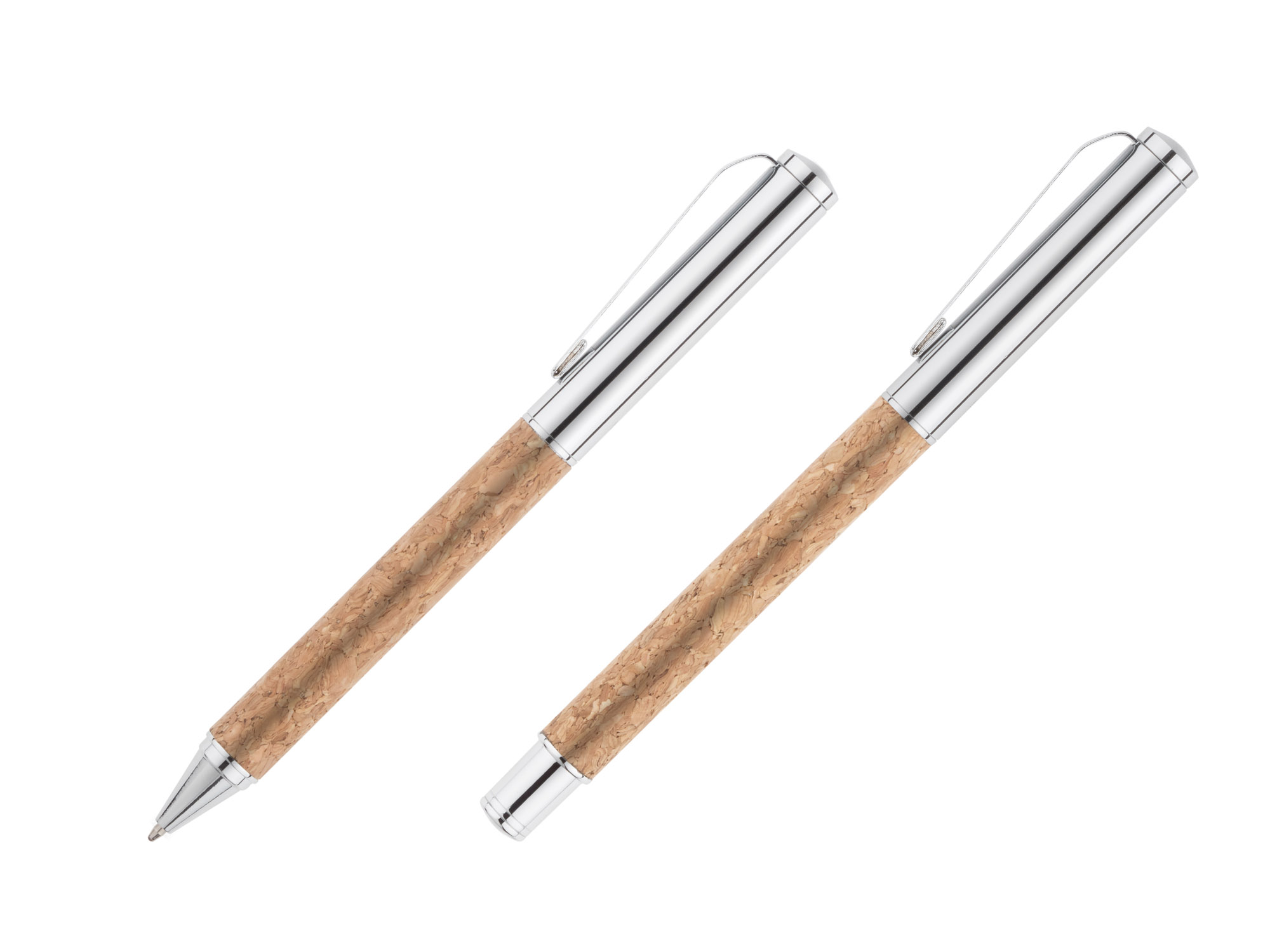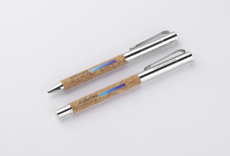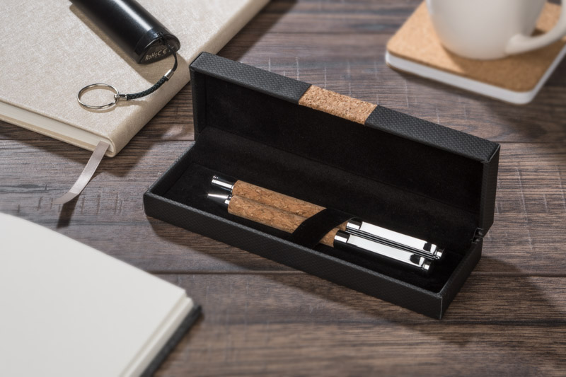 KANSAS to elegancki zestaw piśmienniczy dla miłośników naturalnych materiałów przyjaznych środowisku. W zestawie znajduje się długopis oraz pióro kulkowe wykonane z metalu oraz korka. Gustowne etui w kolorze czarnym ozdobione elementem korkowym. Długopis z mechanizmem typu twist, z czarnym wkładem, pióro kulkowe z zatyczką, z wkładem w kolorze czarnym.