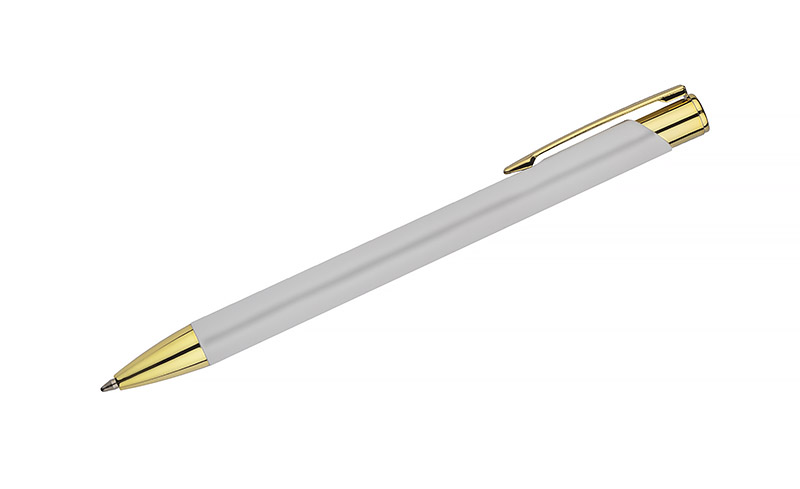 GOLDEN to długopis wyróżniający się przyjemną w dotyku gumowaną powierzchnią oraz wyjątkowo eleganckimi złotymi wykończeniami. Korpus wykonany z aluminium. Możliwość wygrawerowania logo w kolorze złotym, które doskonale pasuje do wykończeń długopisu. Długopis automatyczny. Wkład typu G2 w kolorze niebieskim.