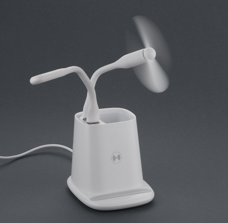Przybornik na biurko BERGO to idealny gadżet do pracy przy biurku. Posiada on wbudowaną ładowarkę bezprzewodową, która służy również jako stojak do telefonu i dwa porty USB: USB-A który zasila dołączone do produktu akcesoria: wiatraczek i lampkę oraz USB-C, pozwalający łądować urządzenia elektroniczne. W przypadku niekorzystania z akcesoriów porty USB mogą funkcjonować jako hub. Dane techniczne: wejście USB-C: 5V/2A, wyjście ładowarki bezprzewodowej: 5W, 2 wyjścia USB: 5 V/2A (maks.)