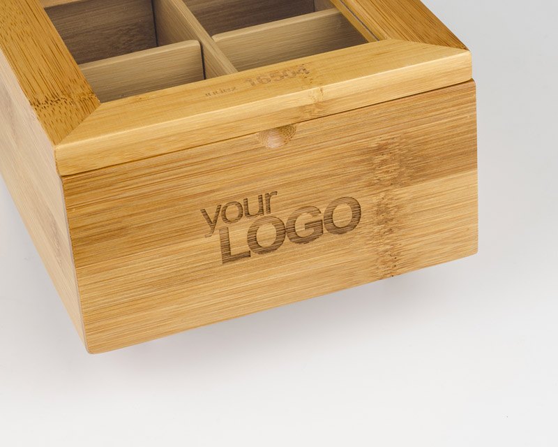 Gustowne pudełko na herbatę wykonane z bambusa. Pudełko podzielone jest na cztery części, dzięki czemu można przechowywać różne rodzaje herbaty.