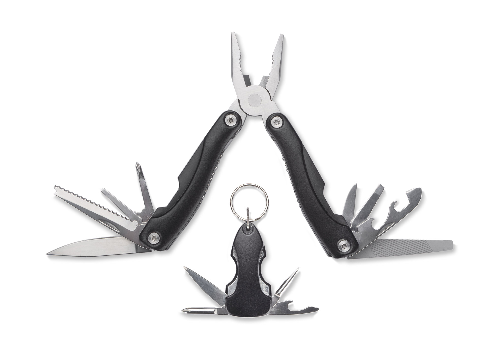 TOOL to zestaw składający się z narzędzia wielofunkcyjnego i breloka narzędziowego. Funkcje narzędzia: kombinerki, przecinak, nóż o gładkim ostrzu, piła, śrubokręt płaski i krzyżowy, pilnik, otwieracz do puszek i butelek. Wyposażony w blokadę wszystkich elementów. Funkcje breloka: nóż, śrubokręt płaski i krzyżowy, otwieracz do butelek, latarka. Oba gadżety zapakowane zostały w ekologiczne, kartonowe pudełko. Wymiary narzędzia wielofunkcyjnego 158 x 68 x 23 m, wymiary breloka 30 x 60 x 18 mm