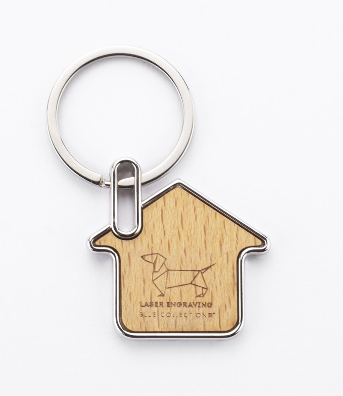 Brelok KUKA w kształcie domku, wykonany jest ze stopu cynku i drewna. Jest lekki i wygodny w użyciu. Drewniany brelok prezentuje się bardzo oryginalnie, a w połączeniu z metalem zyskuje elegancję. Pakowany w brązową, papierową kopertę