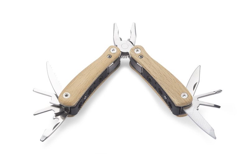 Narzędzie wielofunkcyjne FORT to gadżet w kieszonkowym rozmiarze, wykończony drewnem. Funkcje: kombinerki, przecinak, nóż, śrubokręt płaski i krzyżowy, pilnik, piła, otwieracz do butelek i puszek. W komplecie znajduje się również czarny, materiałowy pokrowiec na narzędzie.