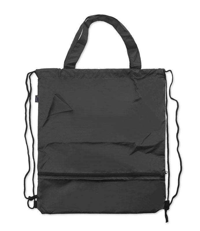 Worek na sznurkach z parasolem RAINY wykonany jest z poliestru RPET, co czyni go bardziej przyjaznym środowisku. Środek worka jest jednokomorowy. Oprócz tradycyjnych sznurków posiada jeszcze rączki o długości 44 cm, dzięki czemu może być używany także jako torba na zakupy. Na dole worka znajduje się zamykana na zamek kieszeń, w której schowany jest dołączony do zestawu parasol, także wykonany z poliestru RPET.