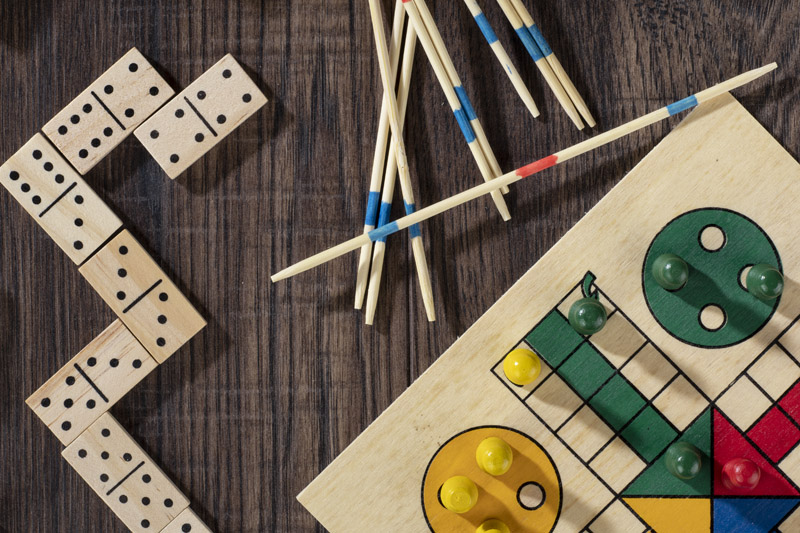 Zestaw gier w praktycznym drewnianym pudełku. Zawiera cztery różne gry: domino, bierki, grę planszową "Chińczyk" oraz talię kart. Logo wygrawerujemy na pokrywce pudełka.